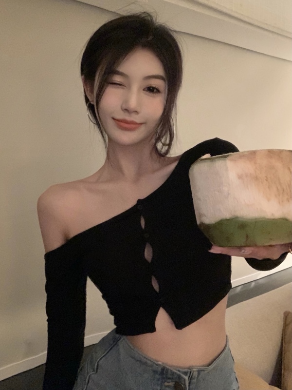 Real price ins foreign style design sense oblique shoulder off shoulder irregular cardigan T-shirt