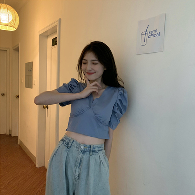 Real price V-neck bubble sleeve blouse summer new slim high waist short pullover shirt